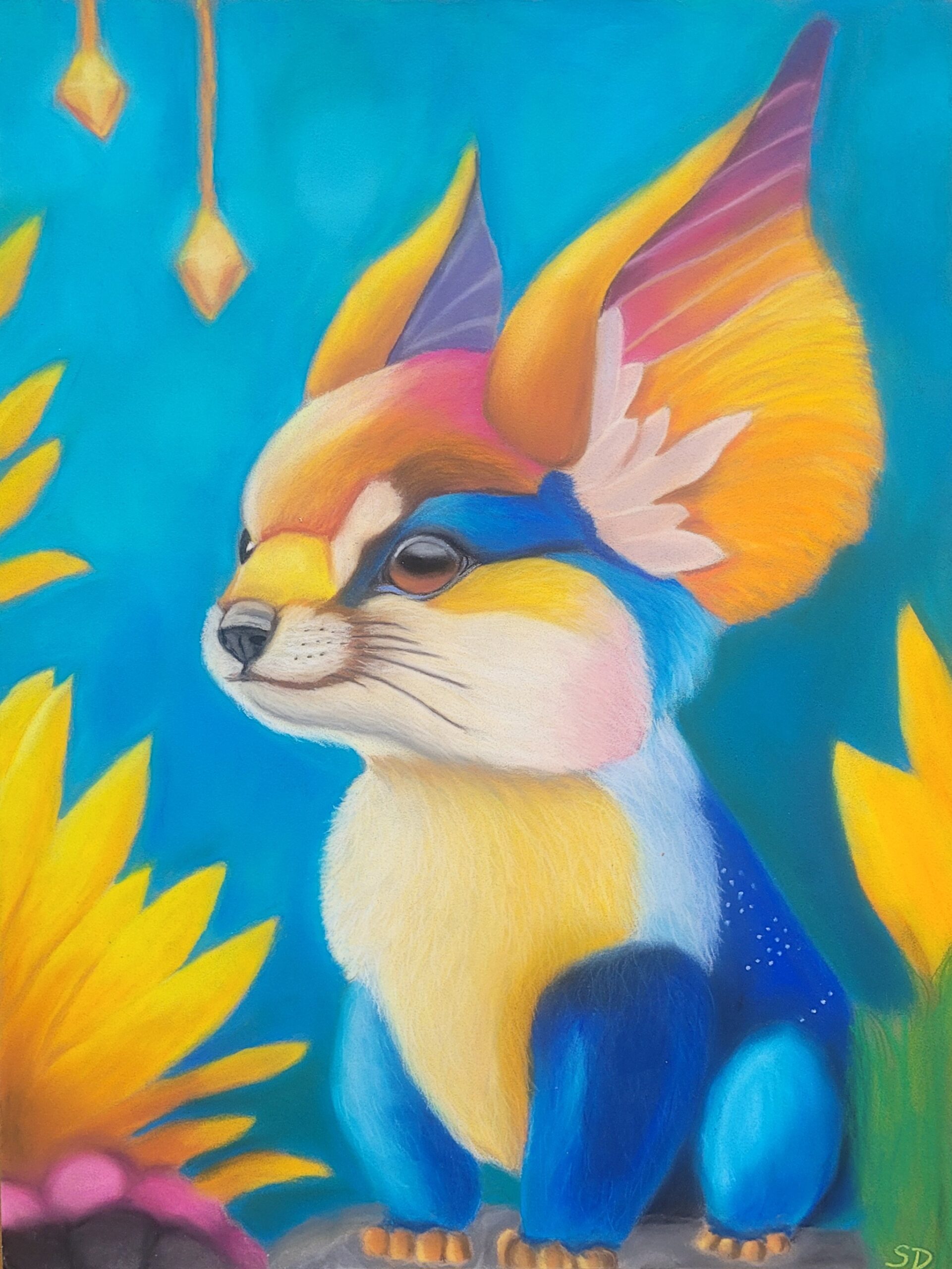 Le Chuchoteur des Forêts vous transporte dans un univers où la magie murmure à travers les arbres. Réalisé aux pastels secs de qualité sur papier Pastelmat, ce dessin capture un animal fantastique, semblable à un rongeur, dont les traits délicats et mystérieux évoquent les secrets d’une forêt enchantée. Les nuances riches et texturées des pastels donnent vie à cette créature, baignée dans une lumière douce et onirique.