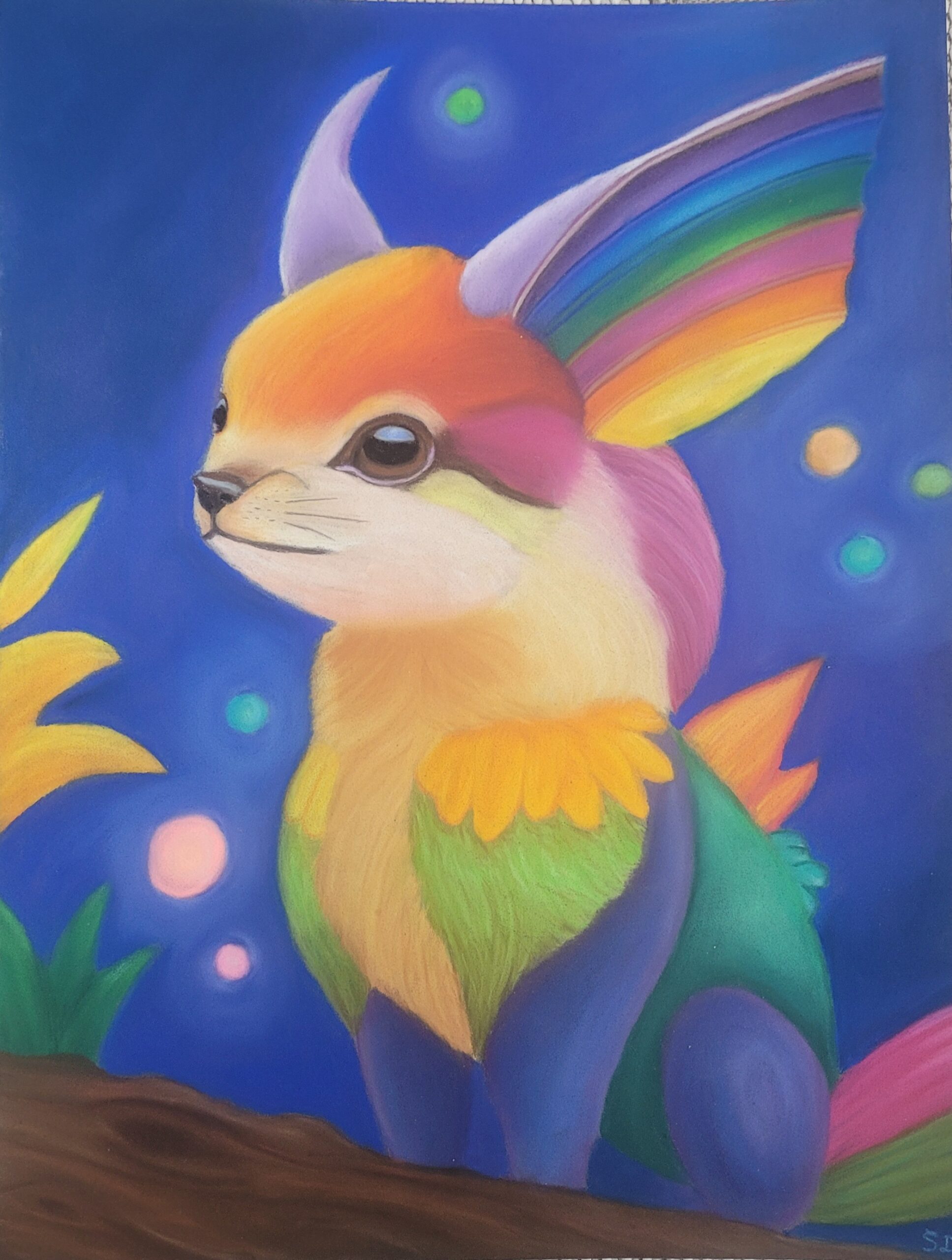 Couleurs Célestes transporte dans un univers vibrant et onirique. Réalisé aux pastels secs sur papier Pastelmat, ce dessin met en scène un animal fantastique entouré de petites sphères colorées flottant dans un fond céleste. Les teintes éclatantes et les textures douces créent une harmonie visuelle, comme un fragment d’un cosmos enchanté.
