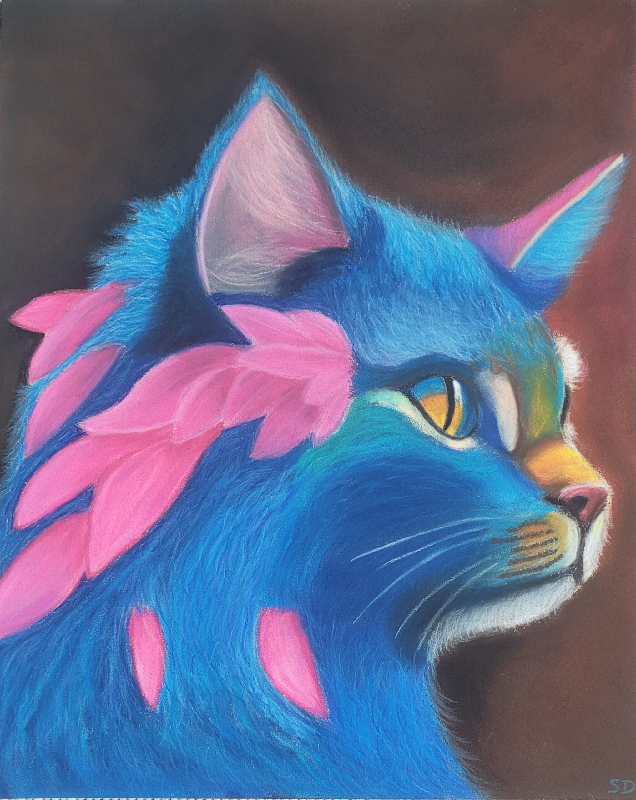 Intense capture une présence vibrante et audacieuse. Réalisé aux pastels secs sur papier Pastelmat, ce dessin représente un chat fantastique aux poils bleus éclatants, orné de quelques plumes roses délicates. Les couleurs vives et les textures soyeuses des pastels créent une œuvre pleine de caractère et de mystère.